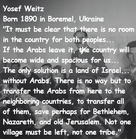 "It must be clear that there is no room in the country for both peoples... If the Arabs leave it, the country will become wide and spacious for us... The only solution is a land of Israel... without Arabs. There is no way but to transfer the Arabs from here to the neighboring countries, to transfer all of them, save perhaps for Bethlehem, Nazareth, and old Jerusalem. Not one village must be left, not one tribe." -- Yosef Weitz
