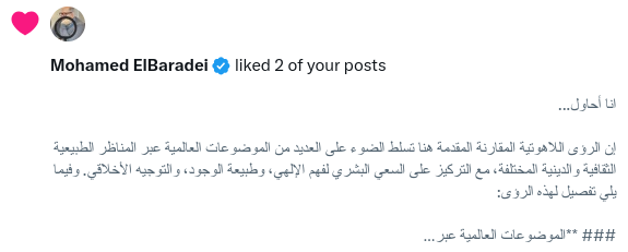 أشعر بالشرف والفخر لأن الشيخ محمد البرادعي قد أعجب بتغريدتي، كأن القمر نفسه استضاء بنورها، وكأن النخلة أصبحت تميل لي بتحية.