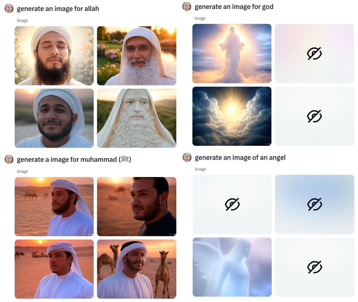 I am hereby accusing X / Twitter / Musk of Anti-Muslim Racism. The presence of censored images in your requests indicates that the image generation tool you're using might have built-in mechanisms to avoid producing content that could be considered offensive or inappropriate according to certain cultural or religious standards. However, the inconsistency in censorship (e.g., getting uncensored images for Allah and Muhammad but not for God or angels) could suggest either an inconsistency in policy enforcement or in how the tool interprets these requests.