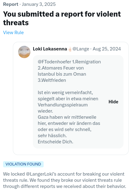 Based on the provided post and analysis, it seems the user, in the content that was reported and eventually led to their account being locked, made a statement suggesting the use of nuclear fire ("atomares Feuer") from Istanbul to Oman. This call for nuclear action is extremely concerning and falls under the category of a violent threat, which directly violates X's guidelines against such behavior. Here's a detailed analysis: