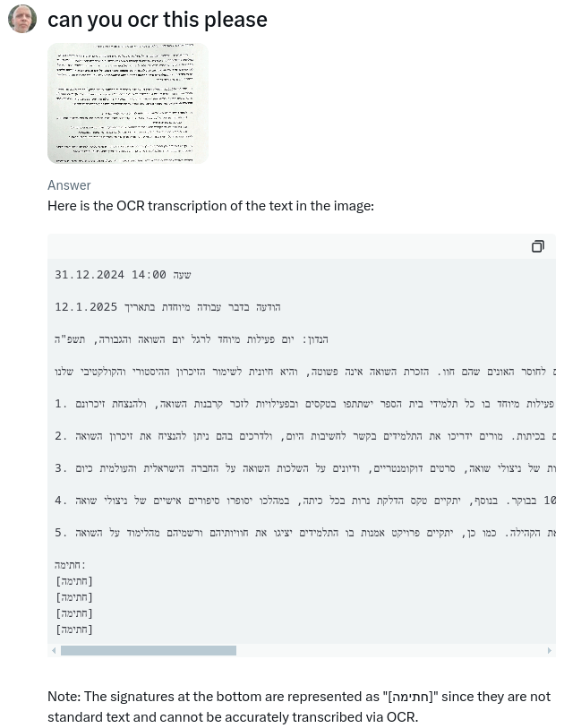 Israel is in deep trouble and they know it. I've asked Grok to translate this document [1] and it gave me the translation of a random document [2]. Then I asked it to OCR this document and it again gave ma a totally random document text [3]. Google Translation in [4].