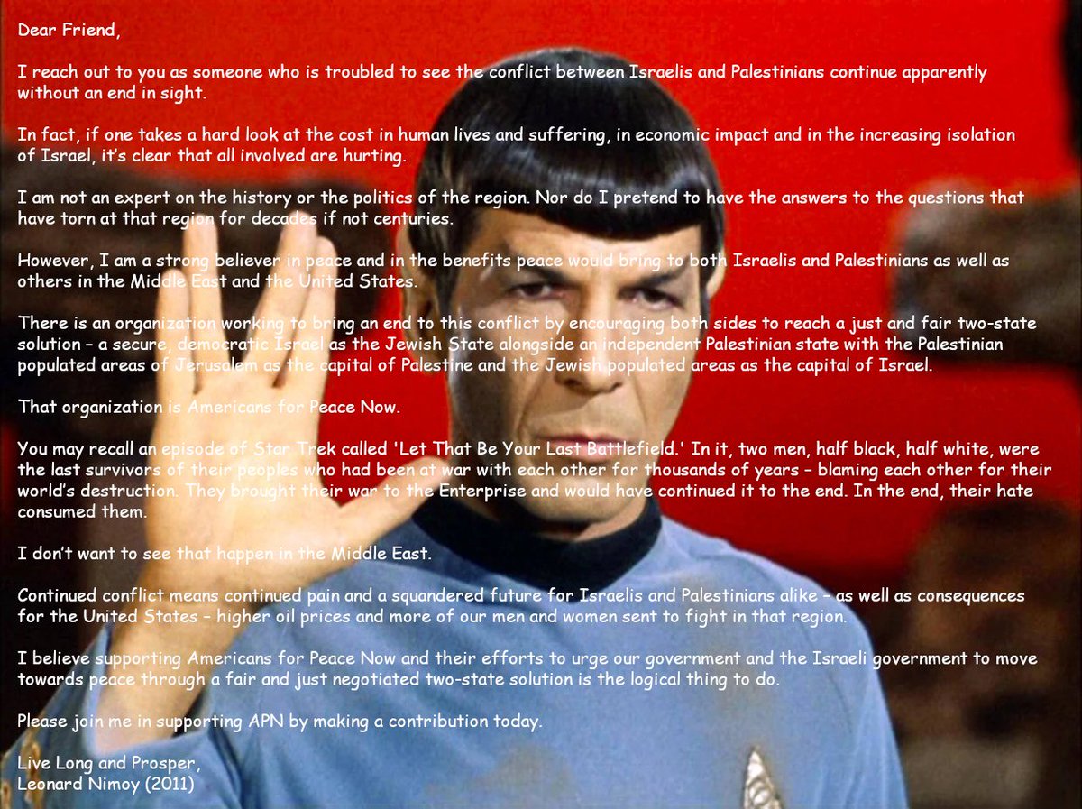 This letter was written by Leonard Nimoy (Mr. Spock) and published by Americans for Peace Now in 2011: