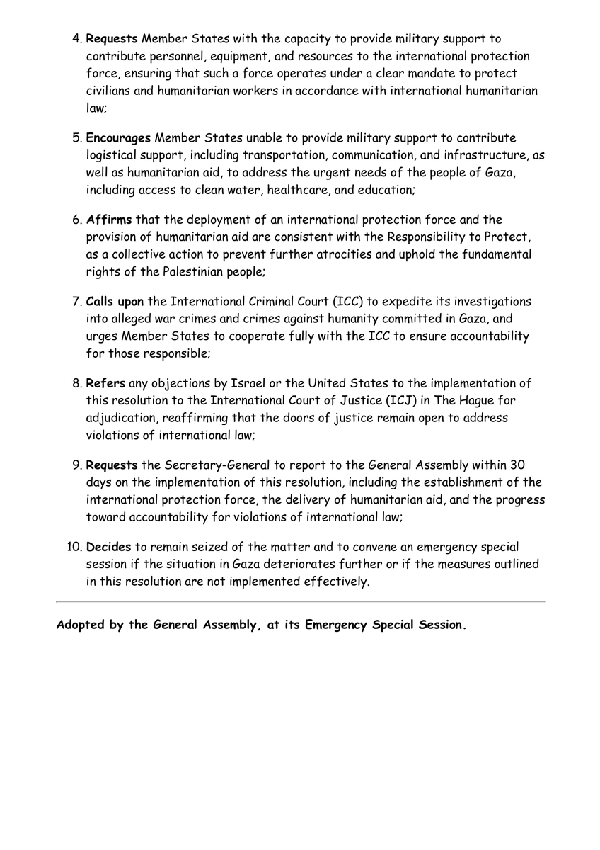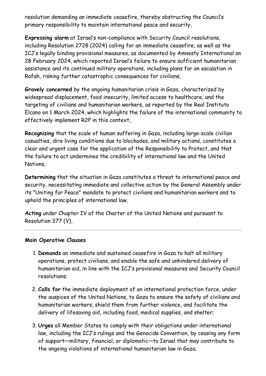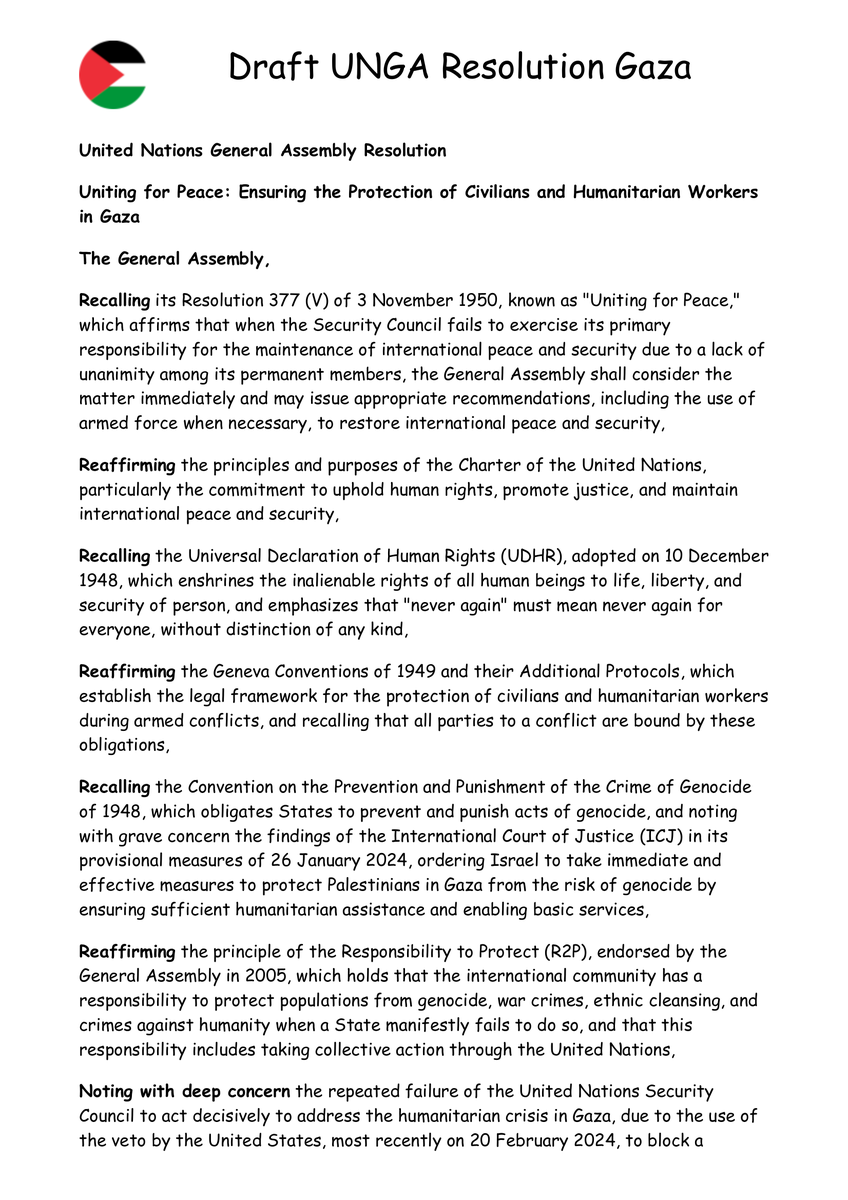@UNRWA The UN must protect Gaza’s people under its Charter, UDHR, IHL, GC IV, CPPCG, ICCPR, ICESCR, CRC, UNSCR 242, 338, 2728, & R2P. I urge the UN to uphold the law, convene ES10, & floor this resolution to ensure their safety. #GazaCrisis