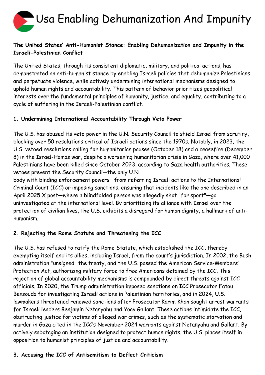 U.S. veto abuse, ICC rejection, and unwavering Israel support enable impunity for alleged war crimes, dehumanizing Palestinians and eroding justice. Condemn this anti-humanist stance perpetuating suffering. #IsraeliPalestinianConflict #HumanRights