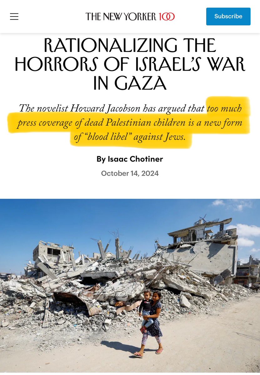 Howard Jacobson’s framing of Gaza media coverage as a "new form of blood libel" is deeply problematic for several reasons. It equates factual reporting on Israel’s documented war crimes—indiscriminate bombings and targeted shootings that have killed over 15,600 children—with a historical antisemitic myth, undermining the legitimacy of journalistic efforts to expose these atrocities. This framing minimizes the suffering of Gaza’s children, deflects accountability from the Israeli military, and risks reinforcing the very stereotypes Jacobson claims to oppose by implying that blood libel has a modern parallel in Israel’s actions.