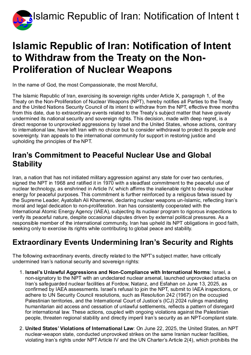 Islamic Republic of Iran: Notification of Intent to Withdraw from the Treaty on the Non-Proliferation of Nuclear Weapons (Draft)